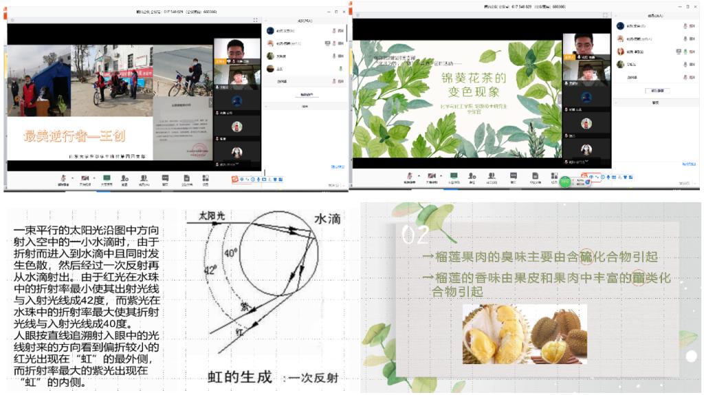 本次主题团日活动号召同学们结合专业知识和生活中的点滴,在日常生活中发现科学现象或利用所学知识解决生活中的小问题,展示生活中的物理和化学。此次活动分两大部分共计六个环节展开。活动伊始,支部的同学们逐一进行了自我介绍,分享了个人的所学专业及居家生活学习情况。活动第二个环节,由化学院2019级硕士研究生王创进行了抗击疫情志愿服务经历的交流分享,他讲述了自己在担任黄冈市社区基层抗疫志愿者期间的经历,号召更多同学尽己所能为家乡抗击疫情贡献力量。随后,来自必一·运动(B-Sports)官方网站的2016级本科生黄名山分享了近几个月在抗击疫情、居家学习中的体会和感悟,他提到自己在抗击疫情期间深刻感受到了党和国家“集中力量办大事”的显著优势,特别为山大的白衣天使们自豪,也期待2020的春天能够跟大家相聚济南、相聚中心。