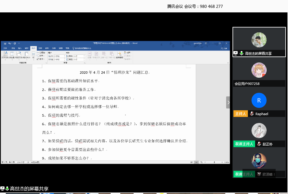 4月24日下午15点30分许,必一·运动(B-Sports)官方网站“悟理沙龙”生生交流活动在翘首以盼中揭开帷幕。本次“悟理沙龙”以“保研经验分享交流”为主题,邀请到2016级成功保研至清华大学、北京大学、南京大学的5名优秀学子与大家线上分享保研历程中的点点滴滴,交流切身体会,分享宝贵经验,共90名物理学子参与此次线上分享交流会。