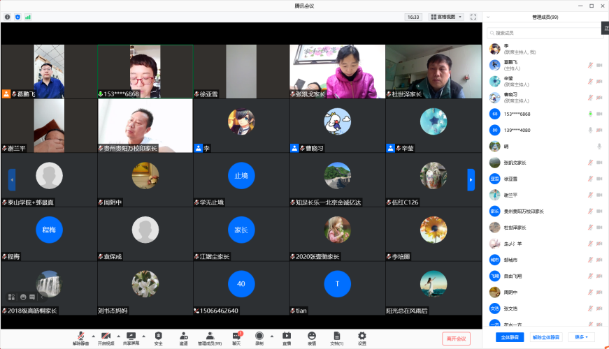 会议伊始,辛莹向参会学生家长介绍了举办此次线上交流会的背景和意义。她指出,2020年全国妇联、教育部印发了《家长家庭教育基本行为规范》,2021年学校发布了《关于做好家校协同育人工作的通知》,家校合作是高校育人环节中的重要一环,学院计划通过举办“家校共育”线上家长交流会进一步增强与学院各年级本科学生家长的联系,强化家校共育的理念,共促物院学子更好成长成才。随后,本科2017级林子涵、苗春阳及2018级孔德龙、杜世泽四位同学的家长先后就他们的育人理念、家风家训及对学生的习惯养成、性格塑造、兴趣培养、氛围营造和与学生的沟通相处等方面的经验进行了分享,分析了学生成长至今家庭教育的作用发挥,介绍了在教育、引导、帮助学生等方面好的经验做法。活动的最后是交流环节,与会家长就如何看待学生的成绩起伏、如何把握对学生的关怀度、学生的成长与家长角色的转变等问题进行了交流讨论。