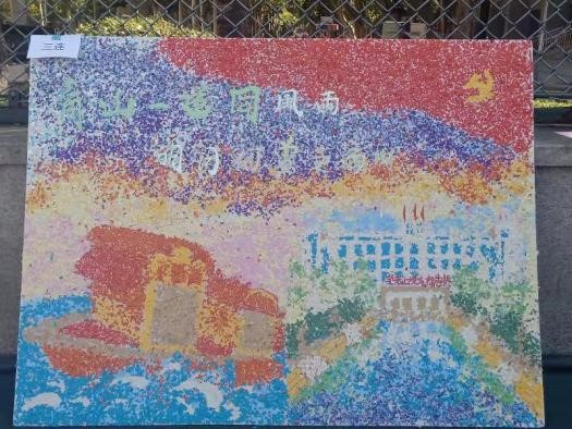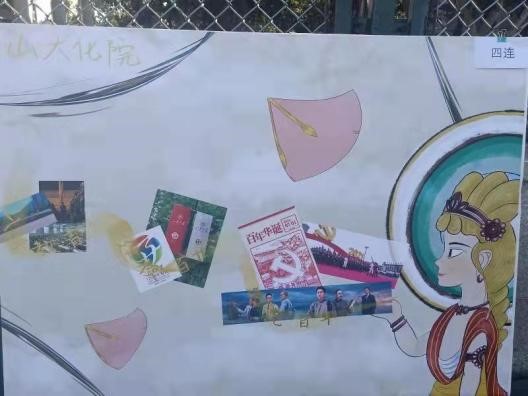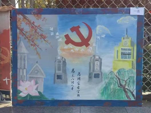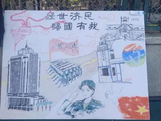 在演讲比赛和合唱比赛的会场旁边,摆放着各连队精美的主题展板,营造出浓厚的爱国爱党爱校氛围。前期,一营各连队分发空白展板一块,各连队充分发挥创造力进行创作。一连的展板形式新颖,由三本日历组成,三个显著的年份分别代表了建校、建党和今朝,日历的封页解开之后,三个割裂的时间转变成一幅整体的画面,在党徽的照耀下,山东大学以全新姿态展现。二连的展板画面内容丰富,将知新楼、训练场、军训学生、山大校门和历史的山大串联在同一幅淮安上,“经世济民、强国有我”的口号彰显二连的昂扬状态!三连的展板点面结合、心思巧妙,彩色的纸屑拼凑成丰富的画面,我党的红船和山东大学中心校区大成广场的景色显现于展板之上。四连的展板绘画精巧,代表希望的女孩呼唤着军训场上的青年学子、山东大学建校百廿和中国共产党成立一百周年。各连的展板立于操场边展示,引来老师同学们的驻足欣赏。经指导员打分,评选出一、二、三等奖。