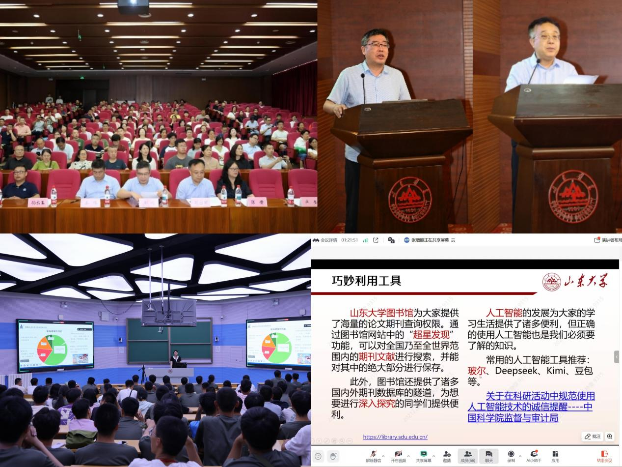 在“卓越与发展”模块,学院通过专业解读与资源介绍,助力新生明确成长路径。9月3日,学院举办2025级新生见面会暨入学教育大会,360余名本硕博新 生参会。大会第一阶段,司宗国院长致欢迎辞,回顾学院办学历程,赵明文副院长解读人才培养体系,各系所中心主任描绘学术发展路径,辛莹副书记介绍学院“四位一体”育人格局,本科新生代表作表态。第二阶段,本研新生分场开展入学教育:本科生专场中,秦伟副院长解读培养方案,各系所教授介绍专业,班主任与在校生代表分别发言;研究生专场聚焦学术规范与职业规划,赵明文副院长强调科研诚信,导师代表分享经验。大会通过系统化入学教育帮助新生适应校园、明确目标,为新生描绘出广阔的学术蓝图。9月12日,学院联合图书馆开展新生入馆教育。通过教学视频向新生介绍入馆规则、座位预约规则、文献阅览与借阅流程,鼓励新生走进图书馆,充分利用优质文献资源,培养自主学习与学术探究能力。军训结束后,学院新生辅导员张静雯陆续组织2025级各班展开新生班会,详细讲解《山东大学学生违纪处分办法(试行)》等学校规章制度,引导新生把外在的约束内化为自觉的行为。同时开展班委选举,快速构建起有序的班级集体。近期,学院还将陆续开展生涯指导讲座以及联合信息办开展网络安全讲座,培养新生网络安全意识,增强学生生涯规划能力。