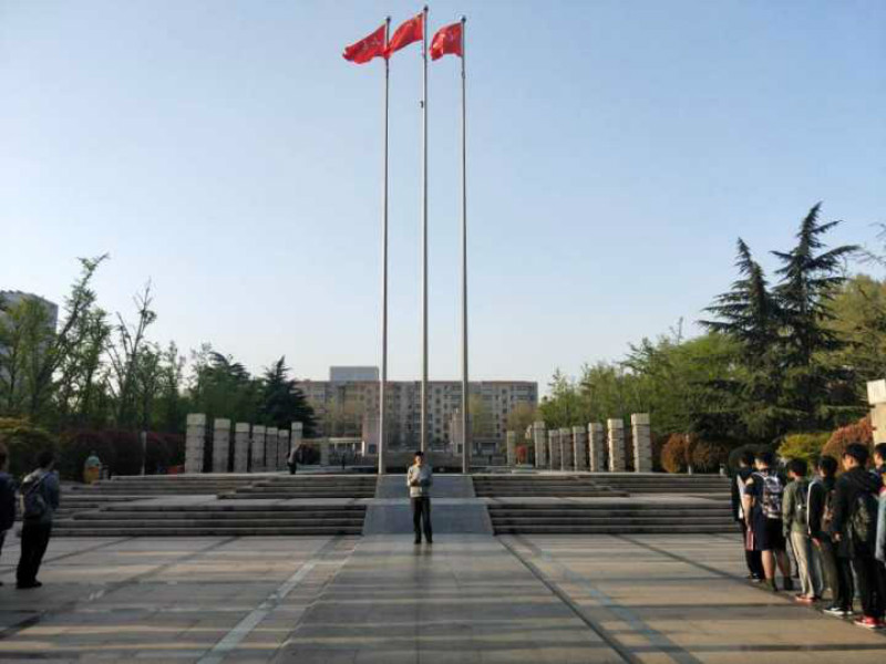4月9日早上6时40分左右,物理班全体同学踏着春日早晨的微风,陆续来到图书馆门前的广场,并自发有序地排队,而在此之前,国防生护旗手们早已着装整齐,列好方队,个个精神饱满,抬头挺胸,等待着国歌地响起,护送我们的国旗升上高空,迎风飞扬。