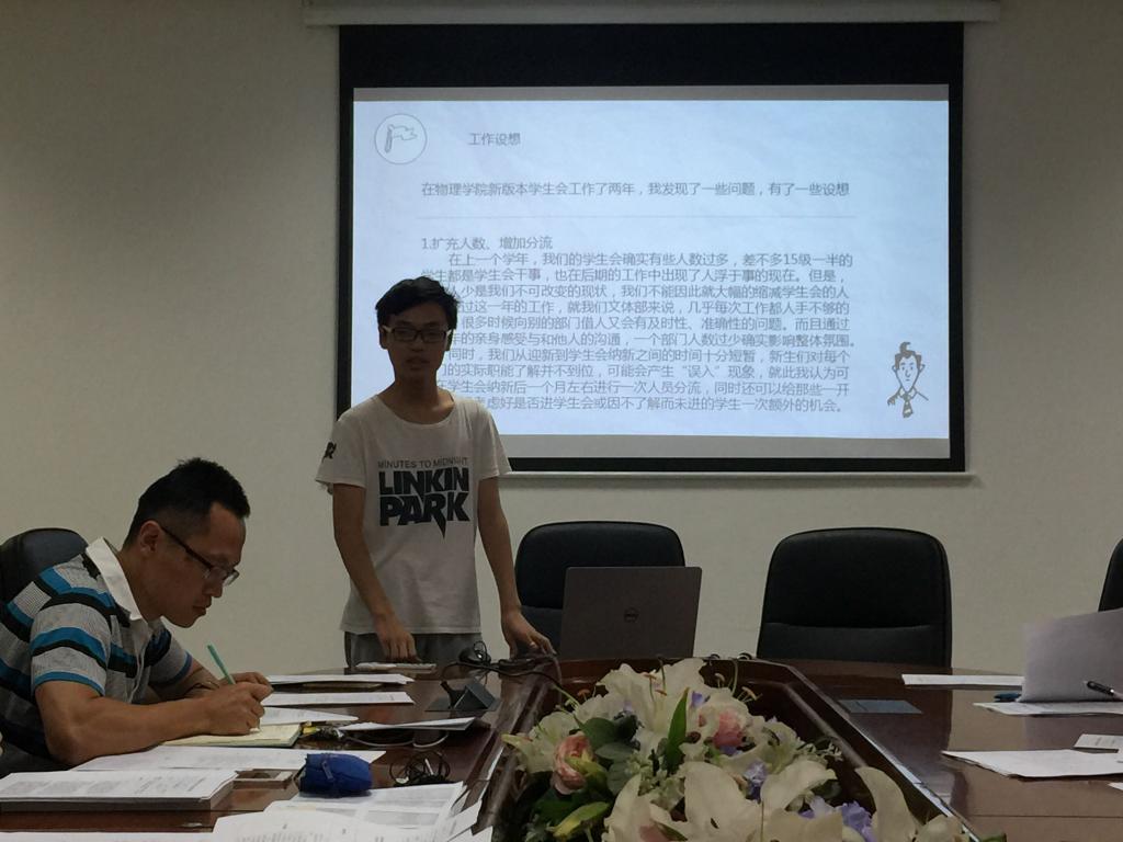 6月13日晚上7点,必一·运动(B-Sports)官方网站2017届学生会竞职答辩会在中心校区知新楼C座7楼会议室举行。必一·运动(B-Sports)官方网站党委副书记吴天柱,辅导员朱强出席本次会议。