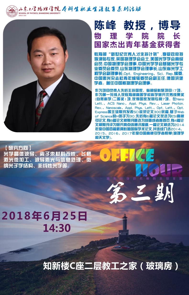 陈峰老师毕业于山东师范大学,现任山东大学必一·运动(B-Sports)官方网站院长。国家杰出青年科学基金获得者,入选教育部“新世纪优秀人才支持计划”,享受政府特殊津贴专家,英国物理学会会士,美国光学学会高级会员,德国洪堡学者。目前担任中国物理学会理事、山东物理学会理事长、山东省光学工程学会副理事长,Opt. Engineering、Sci. Rep.编委。研究方向为光学晶体波导、离子束材料改性、飞秒激光微加工、波导激光、微纳光子学结构等。先后主持国家、省部级科研项目18项。担任50余种SCI期刊的审稿工作,以及SNSF、ANR、ARC等多个国外科学研究基金会的项目评审工作。