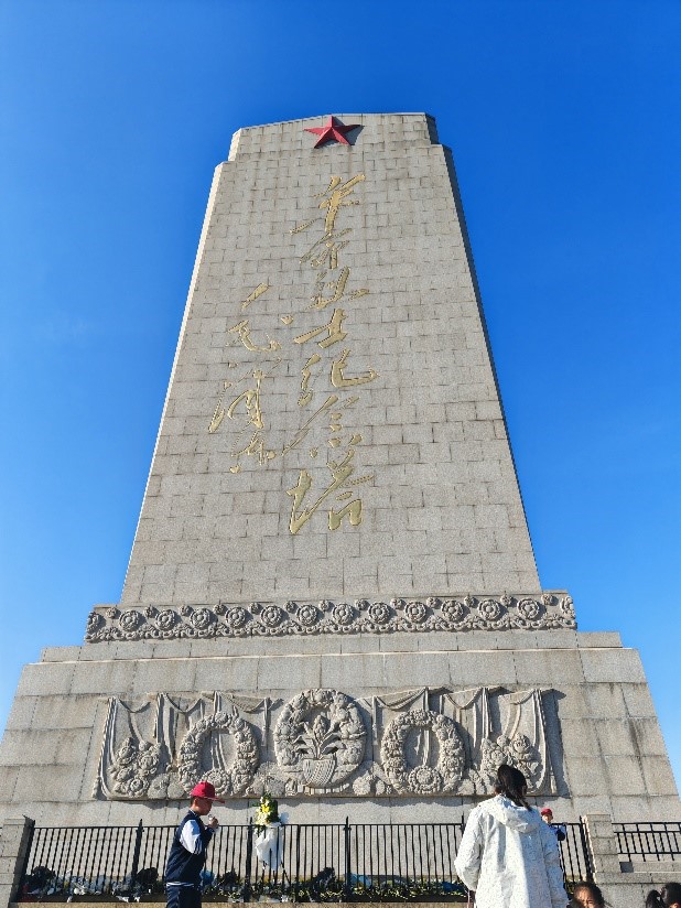 最后的行程是登上纪念碑,同学们瞻仰纪念碑,在那里留下了合影,这不仅是对活动的纪念,更是对英烈精神的传承。站在高处俯瞰,济南这座城市的美丽与平静映入眼帘,让人不由得思考,这一切安宁的背后,是无数英雄用鲜血和生命铸就的。