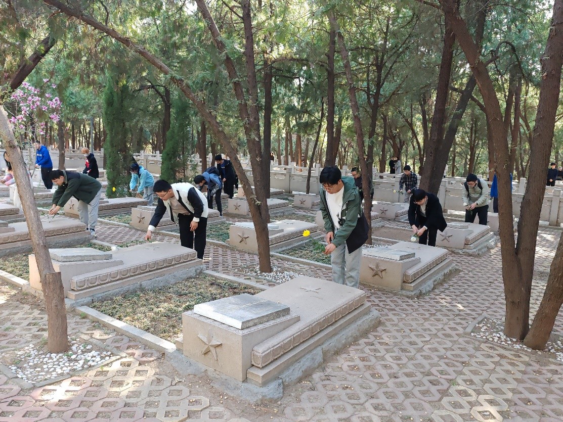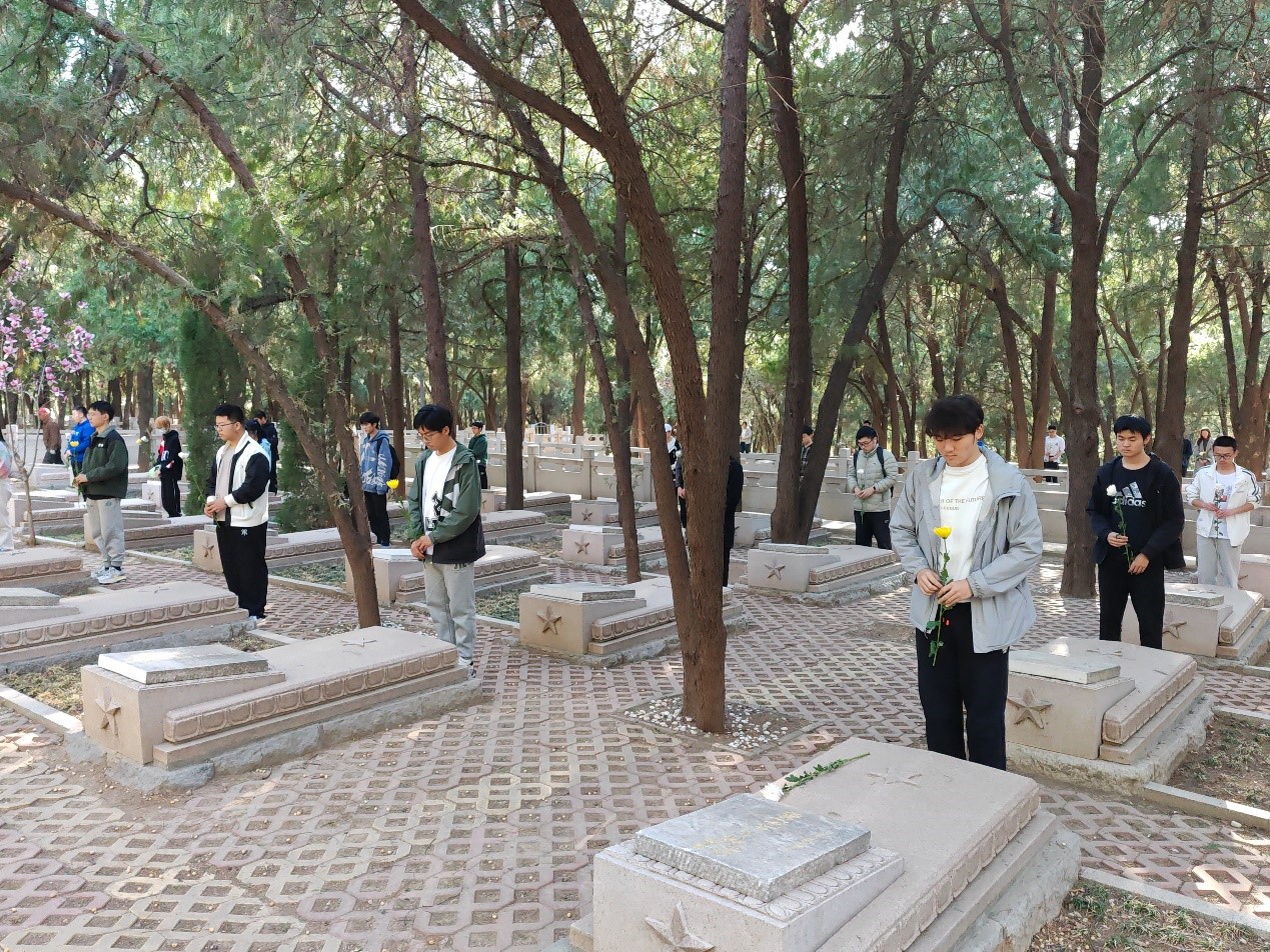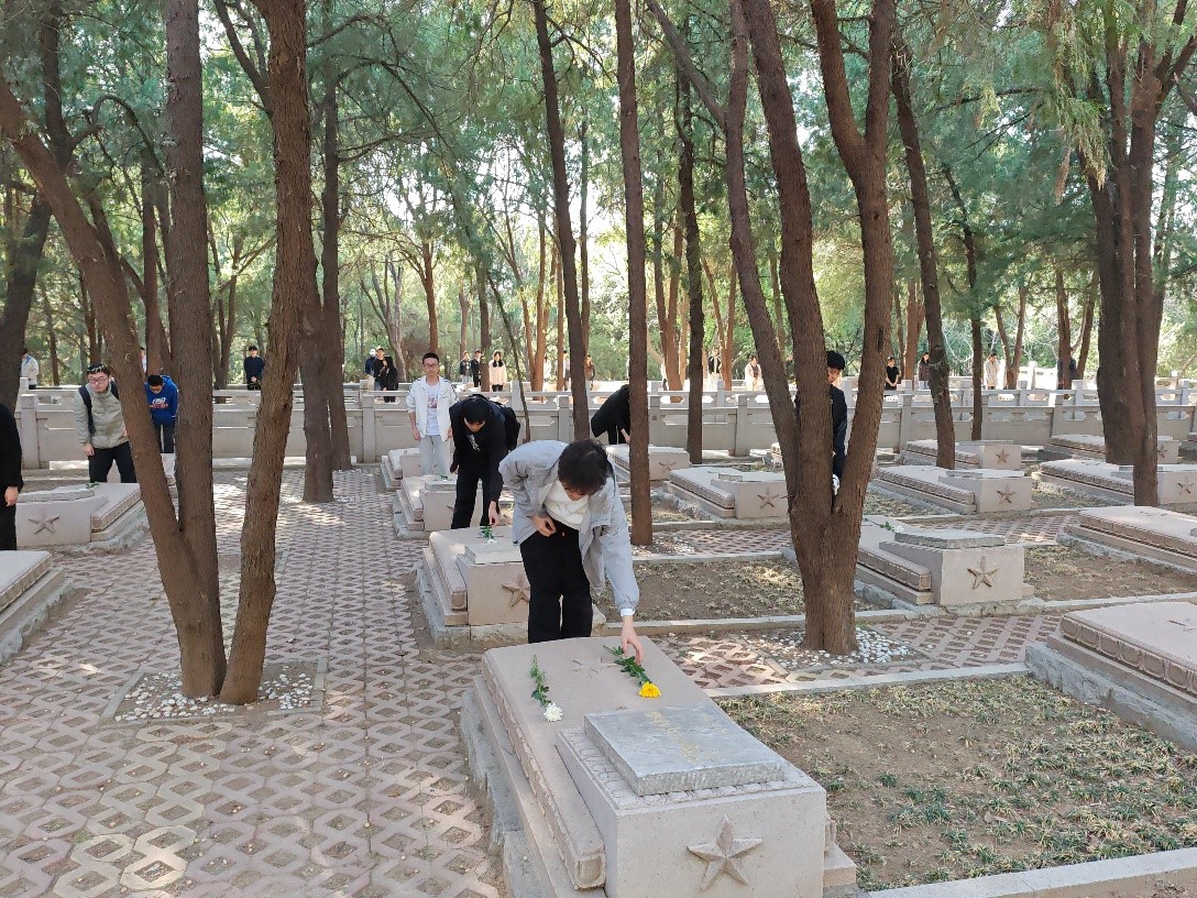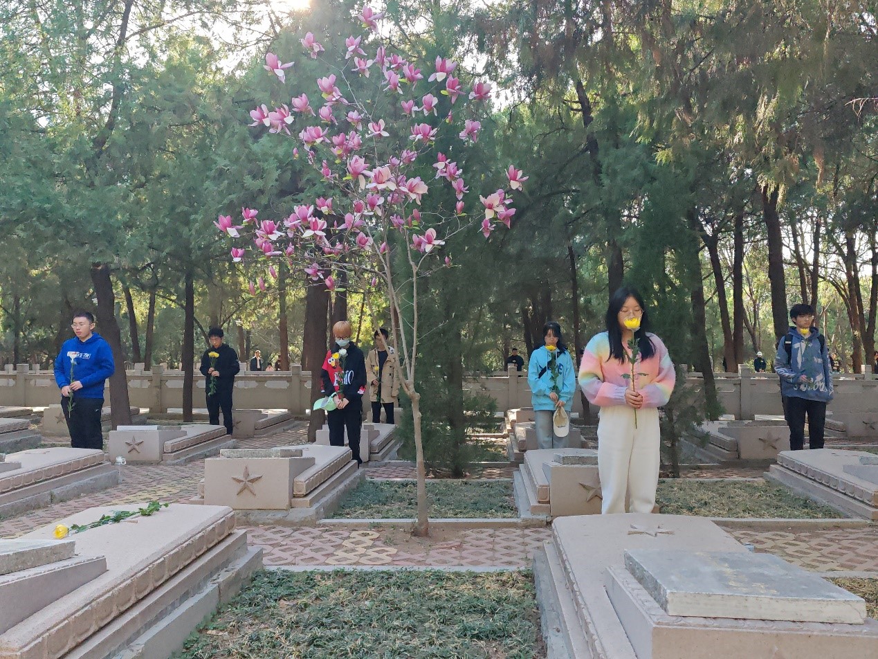 第二站,同学们手拿鲜花,列队整齐地前往烈士陵园墓区。在那里,同学们统一向烈士墓碑敬献了鲜花,随后全体肃立,进行了默哀仪式。风吹过松涛,仿佛能听到英烈们的回声,告诫后人不忘初心,继续前进。